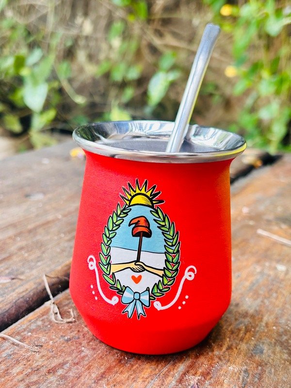 Mate de acero inoxidable color decorado en dtf, incluye bombilla.