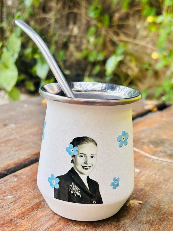Mate de acero inoxidable color decorado en dtf, incluye bombilla.
